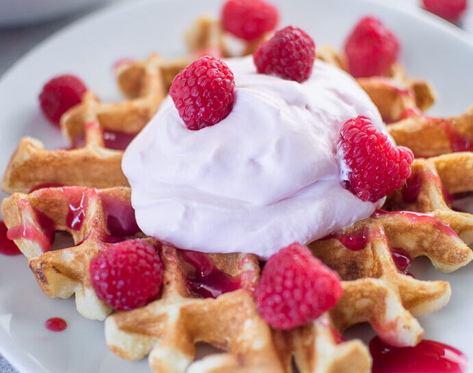 These delicious buttermilk waffles get topped with a raspberry mascarpone cream and finished with a champagne raspberry drizzle that lands somewhere between a sauce and a syrup. Plus, they’re pretty enough to put out for a shower, holiday brunch, or one of those slower weekends when you want breakfast to feel like an event.